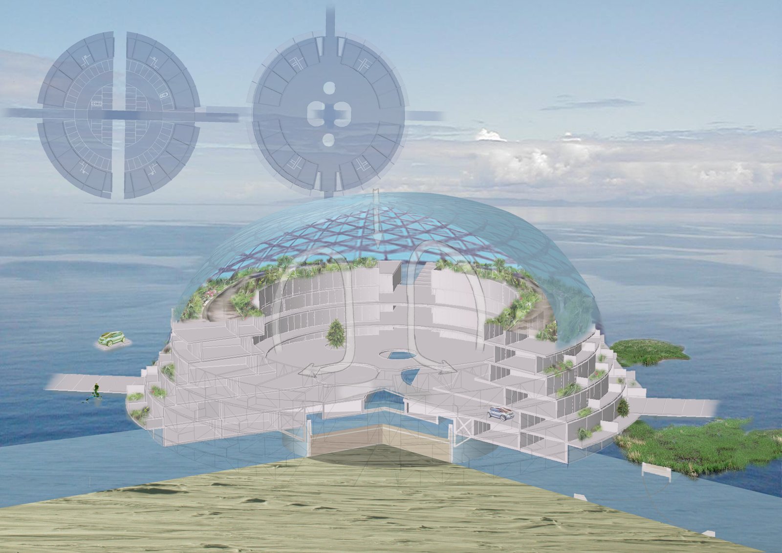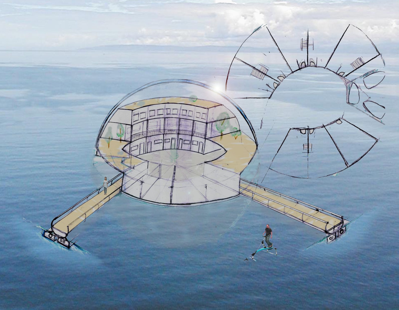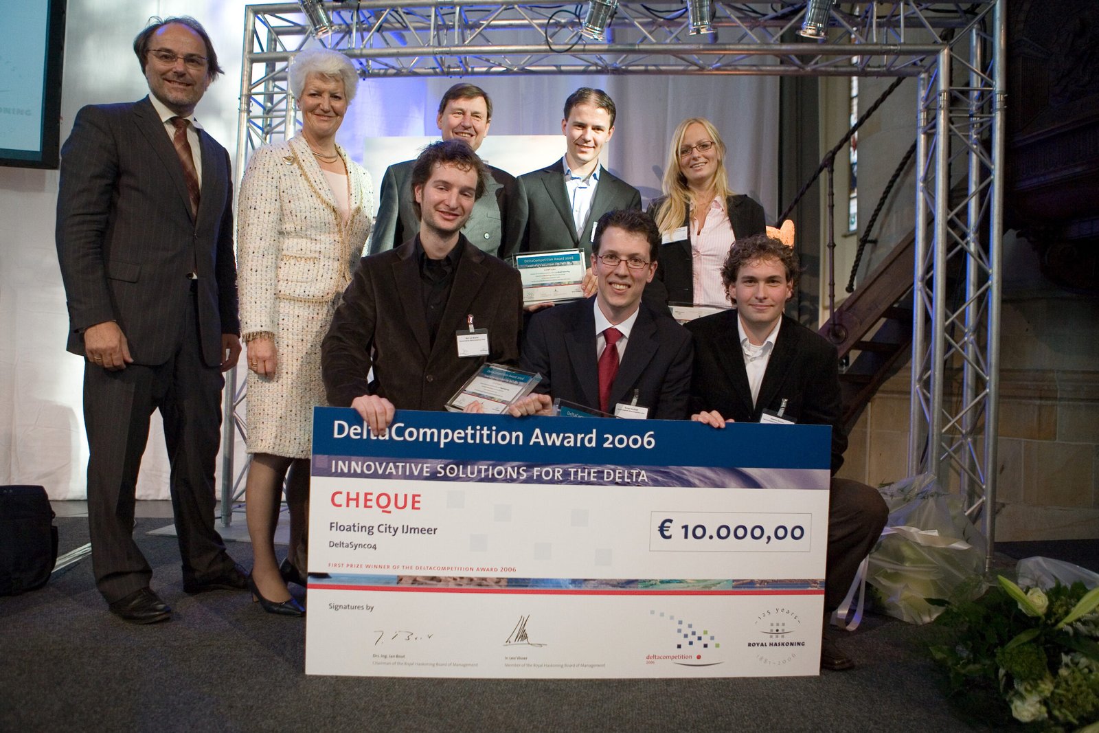 The concept drawings of the 2006 Floating City Ymeer are one of the first visions of how a floating city could look like. Bart van Bueren envisioned dome-like structures of apartments and an inner courtyard. These iconic dome shapes were later also used for Bart’s design of the Rotterdam floating pavilion. This floating city design, along with a paper was awarded the first prize at the Royal HaskoningDHV Deltacompetition.